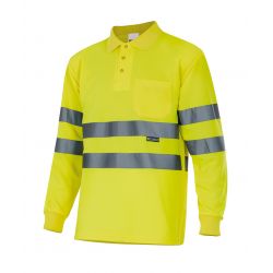 Polo de alta visibilidad de manga larga realizado en tejido transpirable. Cintas reflectantes en torso y mangas, cuello de canalé con abertura central con botones, puños de canalé y un bolsillo en el pecho. COMPOSICION: Brid-eye 100% poliéster 160 gr EN ISO 13688:2013 / UNE-EN ISO 20471:2013