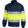 Jersey bicolor de punto de alta visibilidad con cuello alto y cintas reflectantes en torso y mangas. Cierre central con cremallera, puños de canalé y refuerzo de tejido en los hombros en color contraste. COMPOSICION: Punto canalé 100% acrílico NORMATIVA: EN 340 EN 471
