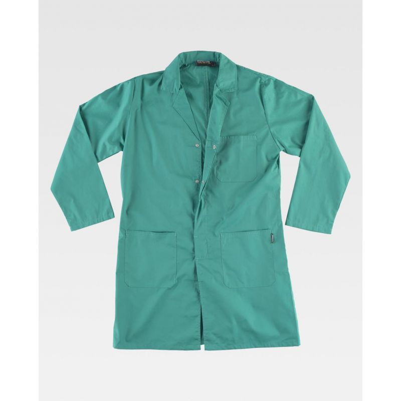Bata unisex con cuello solapa y cierre central de corchetes ocultos. Un bolso de pecho y dos bolsos laterales de plastón. Manga larga. Cinto en la espalda.