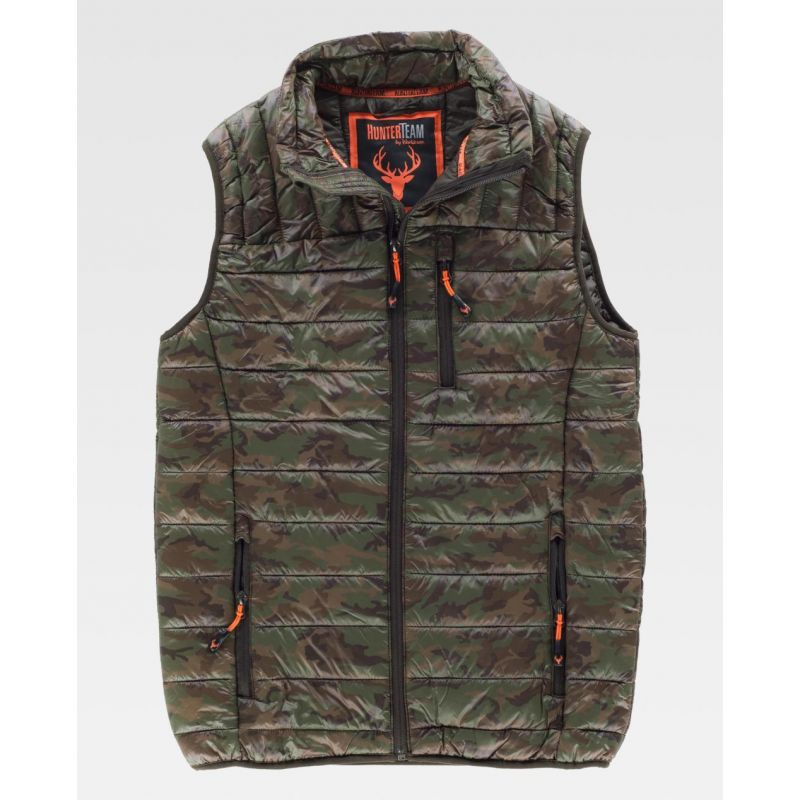 Chaleco acolchado de estampado camuflaje. Cuello alto y cierre de cremallera de nylon. Solapa protectora interior vuelta en la parte superior cubriendo la cremallera. Un bolso de pecho y dos laterales interiores con cierre de cremallera de nylon. Dos bolsos de plastón en el interior.